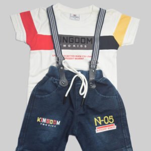Boys Half Sleeves Printed T-shirt & Jeans Shorts with Suspender – White and Blue